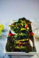 - 1 Preheat your oven to 500 degrees F. Wash, dry and trim your broccoli, then cut the heads into long pieces. Some florets are fine, too, but you want there to be enough stem for crunch. Place the broccoli on a parchment lined baking sheet.