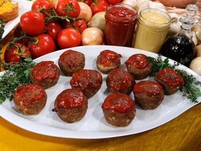 5. 5 While the meat loaves are baking, whisk together the ketchup, mustard, and Worcestershire sauce. After baking for 20 to 25 minutes, remove the pan from the oven. Brush the tops of the loaves with the glaze, using it all up, and return the pan to the oven. Bake for 10 minutes more, or until the glaze has thickened and the meat is completely cooked through, 30 to 35 minutes total. Run an offset spatula or butter knife around the edges of the muffin cups and pop out the meat loaves. Serve hot.