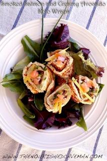 - 13 Spread about 2 tablespoons of Avocado Cream on each wrap, then distribute salmon and crab on top.